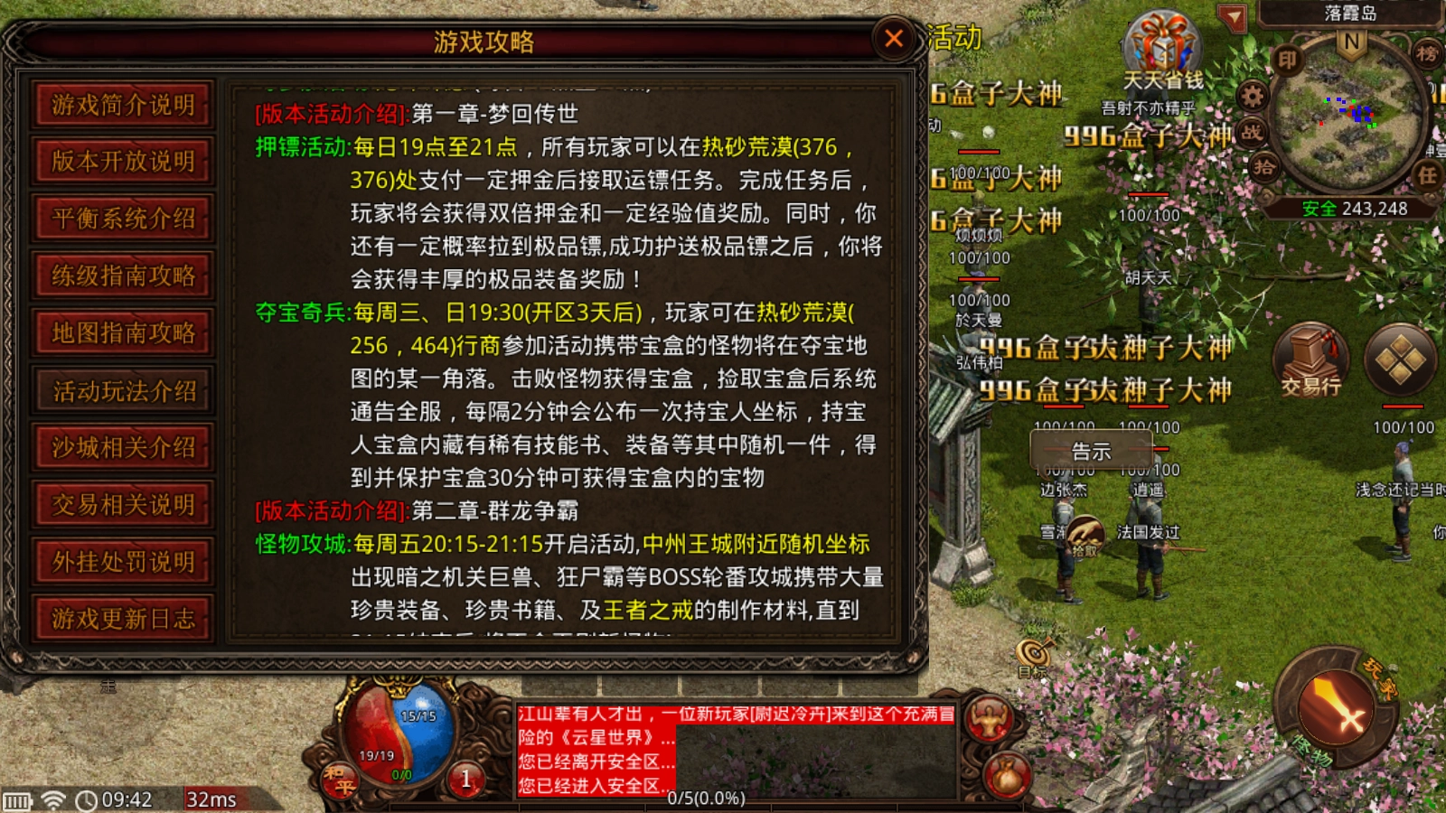 每周三与周日的19:30(开区满3天后开启),玩家可前往热砂荒漠坐标(256, 464)的行商处参与活动。携带宝盒的怪物会随机出现在夺宝地图的某个角落,击败该怪物即可获取宝盒。成功捡取宝盒后,系统将向全服发布通告,且每隔2分钟会公布一次当前持宝人的坐标。宝盒内藏有稀有技能书、装备等随机一件道具,玩家需持有并保护宝盒满30分钟,即可获得盒内的宝物。