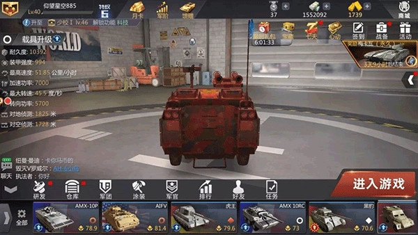 高精尖装备是现代武装力量的标志性体现,在游戏中玩家能够自主对自己钟爱的战车进行改装,加装外挂装甲、机枪、地雷乃至导弹等部件,从而衍生出更加丰富多样的策略玩法与战术协作方式!此外,游戏配备的智能评级系统,会依据载具在不同战场的实力评分以及玩家的天梯段位,自动为玩家匹配实力水平相近的对手。这使得每一场战斗都能实现旗鼓相当的对抗,让玩家体验到激烈畅快的战斗乐趣!
