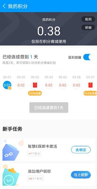 打开智慧e保应用,点击底部导航栏的“我的”选项,随后进入“做任务领积分”的活动页面。