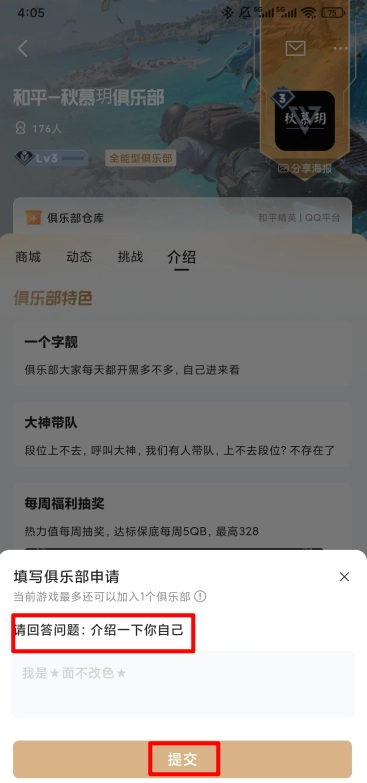 如图所示,需要介绍自己,点击底部"提交"即可。