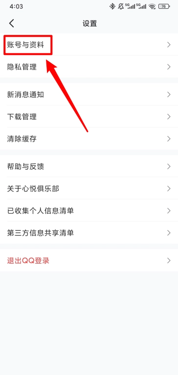 然后在设置页面点击"账号与资料"。
