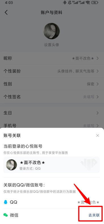 点击微信栏目里的“去关联”选项绑定微信就行啦,绑定完成之后就能切换使用了。