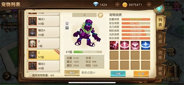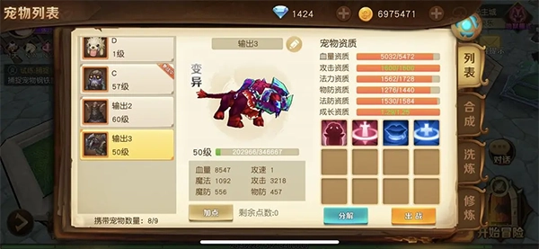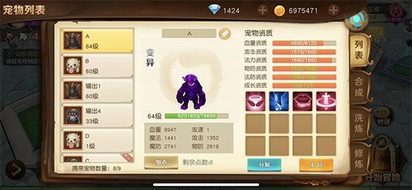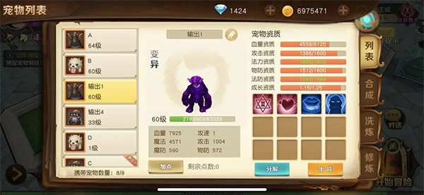 首先可以随意捕捉自己喜欢的野生宠物,接着用果子进行洗练将其变成宝宝;如果金币充足的话,就继续用果子洗练,直到洗出变异状态,之后再使用大果子接着洗,目标是获得成长值都比较不错的宠物。需要注意的是,不管洗练出来的宝宝初始有几个技能,最终通过打书最多只能达到4个技能,这就是所谓的满技能了。就像图中展示的这个宠物,它的资质已经可以满足使用需求了。
