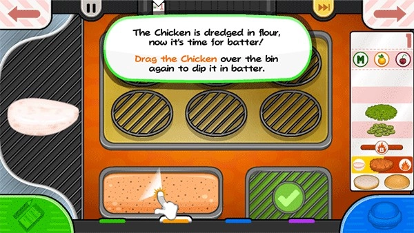 给鸡肉裹上各式各样的面包屑与面糊,再放进油炸锅烹炸至金黄酥脆!Papa Louie 想在竞争中脱颖而出,说不定过段时间,他就会推出鸡肉之外的其他油炸食材呢!