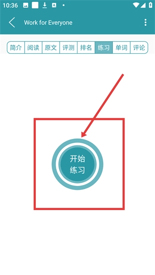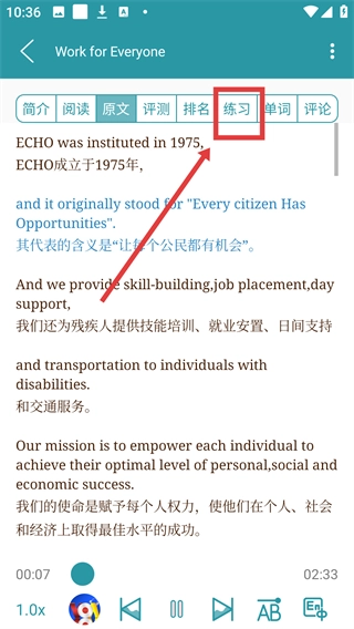 进入文章页面后,点击顶部的【练习】选项,就能切换到练习板块,为开展与内容相关的练习做好准备啦。