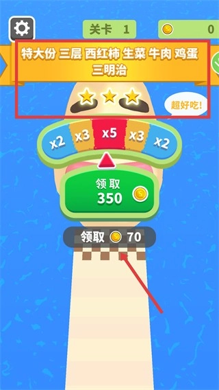 完成三明治的制作后,会得到【特大份-三层-西红柿-生菜-牛肉-鸡蛋-三明治】的评价,点击【领取】按钮就能获得70金币。