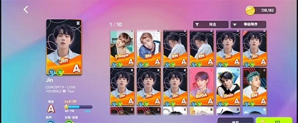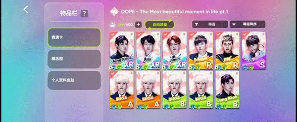 比如我这里Boy With Fun能组成这样的阵容,原因在于bang bang con和花1 dope的主题卡都可以用来演绎Boy With Fun,但Suga和V的卡片在花1 dope里的级别,要比在bang bang con中的级别低。