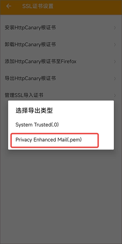 导出类型选择下面的.pem格式【我这边是未root的环境,所以选.pem;要是root之后有更高的要求,也可以选择.0格式】