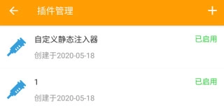 修改完成后,点击右上角的对勾图标完成保存操作。保存结束后,进入设置页面找到插件管理选项,就能看到刚才创建的静态注入插件,点击启用按钮即可。