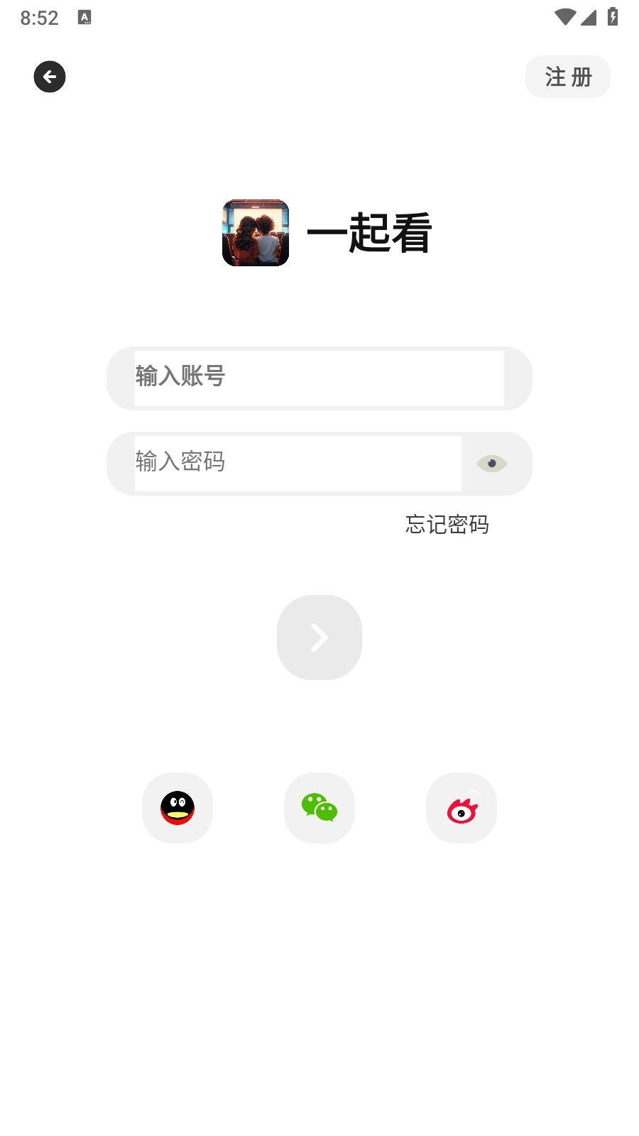 打开一起看应用,进入登录页面后,点击页面右上角的【注册】按钮。