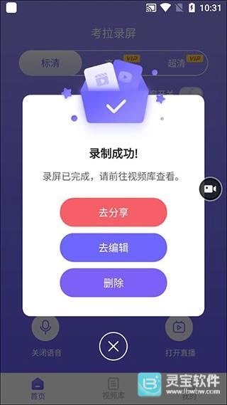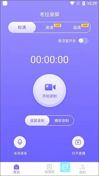 进入首页后,在首页就能直接开始录制,并且提供标清、高清和超清三种不同的画质模式,操作起来十分便捷。