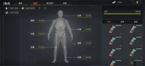 这时身体机能会受到影响。“头部”和“胸部”是损伤即撤离失败的部位,因此要尽快治疗。手臂损坏时,会降低开镜速度和持枪稳定性,搜索物资的效率也会大幅下降。腿部损伤会严重降低移动速度,导致无法奔跑。腹部受伤时,会使人无法趴下,并且加速流失水量和能量。