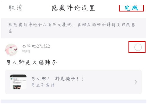 勾选需要隐藏的评论条目,完成选择后点击上方的“完成”按钮以确认设置。