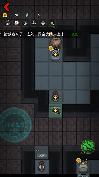 上床后能从NPC那里得到大量金币和电力,建议先升级门,再布置防御设施。