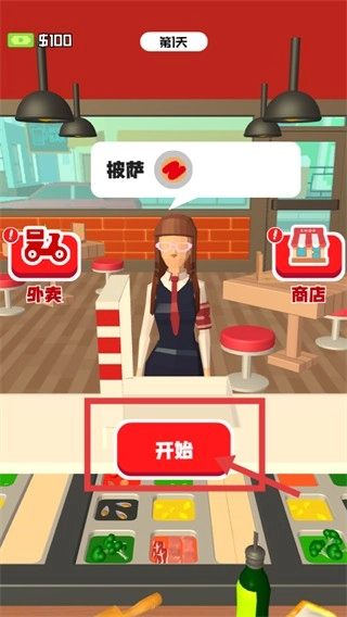 界面上呈现【第1天】的标识,当前设定的目标是【披萨】。点击界面中标注着【开始】字样的按钮,即可进入披萨的制作流程。在后续操作过程中,还能利用【外卖】和【商店】这两项功能来提供辅助。