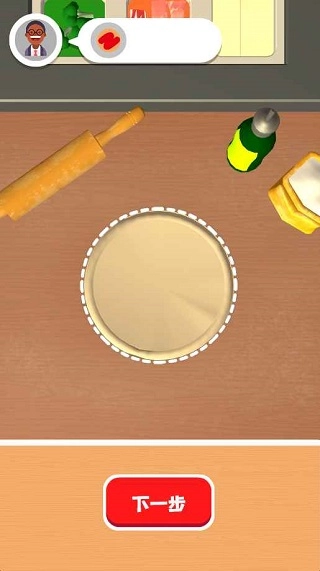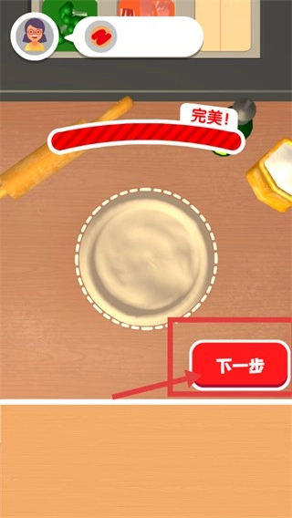完成面团制作后会出现【完美!】的提示,此时点击标注好的【下一步】按钮,就能推进披萨制作的后续流程,让制作进度得到提升。