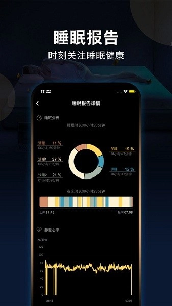 【睡眠报告】呈现用户的睡眠周期情况,对深睡、浅睡、REM睡眠及清醒状态的占比进行统计分析,同时给出科学合理的睡眠质量评分。