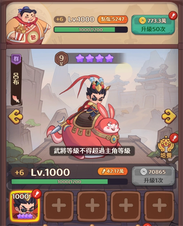 主角等级决定了武将等级的上限,所以前期资源要优先投入主角和主C,二者等级需保持一致,辅助类角色升到1000级点满技能就足够了。