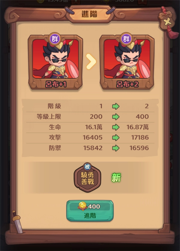 玩家能够花费铜钱来提高主角的等级,当等级达到100、200、400这类关键节点时,就需要使用进阶丹进行升阶,以此来解锁等级上限。