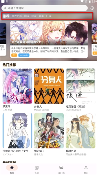 打开喵呜漫画,首页上方能看到最新的国漫、韩漫、日漫等板块内容。