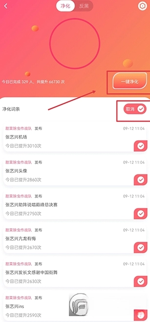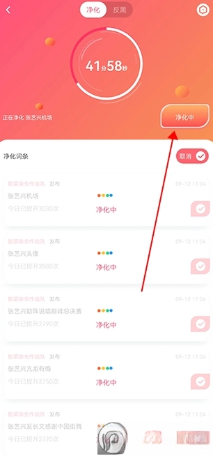 进入净化界面后,可点击单个词条进行净化,也能先点击全选按钮选中所有内容,完成选择操作后,再点击一键净化按钮即可。