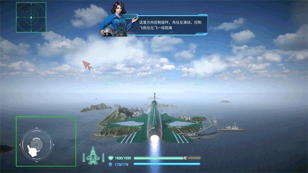 接下来可按照指引操作机器,左下方的圆形部件是方向控制摇杆,你可以先向左滑动它,以此控制飞机朝左飞行一段距离。