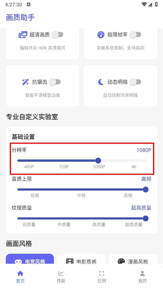 滑动到底部还可以自定义分辨率、音质、纹理质量。