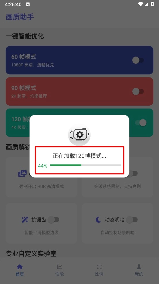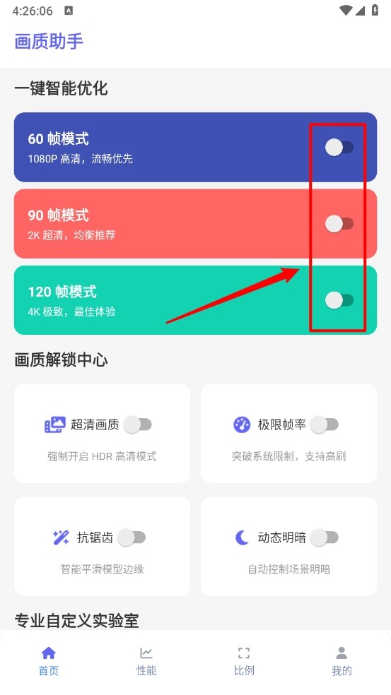 根据个人需求开启对应帧率的开关,如图所示,系统便会自动进行优化。