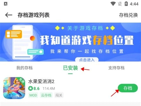 当我们玩了一段时间退出游戏后,可以进入已安装分类,点击存档选项。