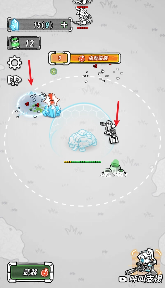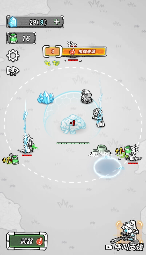 等怪物出现后,我们的武器设备就会自动攻击范围内的敌人。
