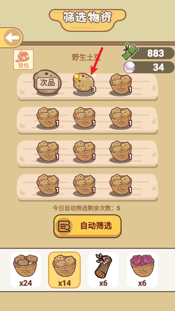 采集好的资源需要经过筛选才能用来做菜,点击即可进行筛选。