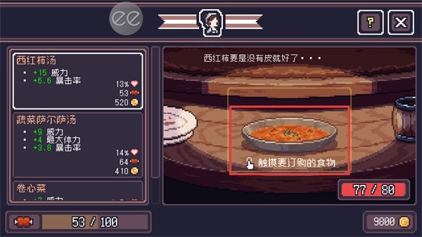 点击想要订购的食物(比如西红柿汤),花费金币完成购买,以此提升角色的各项属性,为接下来的地牢冒险强化战斗力。