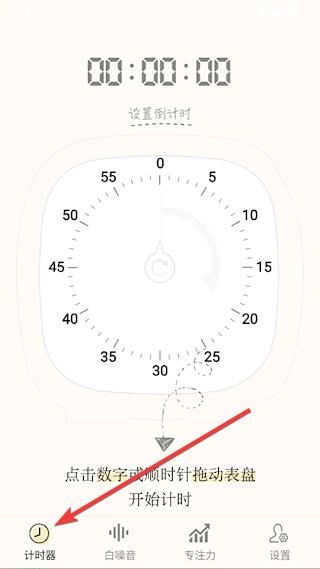 打开计时器Timer应用后,首页默认显示的就是【计时器】功能界面,你既可以直接点击数字来设定计时时长,也能通过拖动时针的方式完成计时设置。