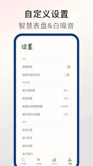 计时器Timer提供多种个性化设置选项,包括提醒音效、界面颜色以及背景声音。