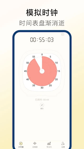 核心功能是视觉化计时,动态色块会沿逆时针方向递减,以此显示剩余时间。同时提供了高度自由的个性化设置选项,包括表盘的色调、提示音效以及多种自然背景声音。专注模式可以设定目标时长,并且拥有自动周期循环和数据记录的功能。