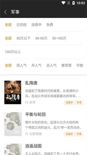 挑选一部感兴趣的作品,再依据状态(完结/连载)、字数、人气等条件完成排序与筛选;