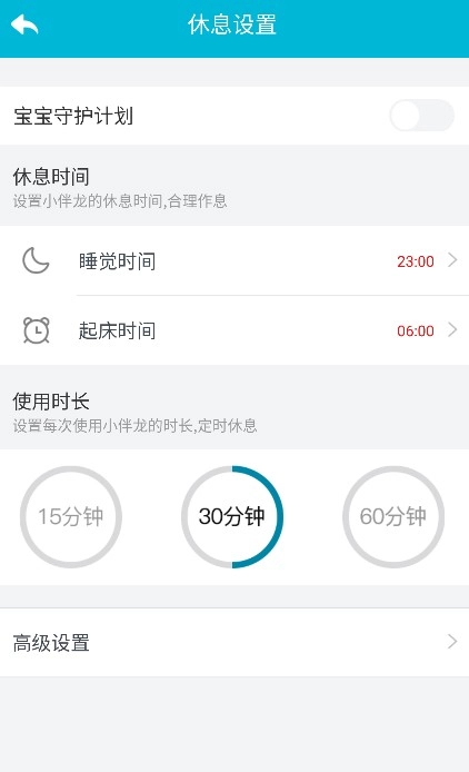 进入后,家长可在此设置休息时间,关闭宝宝守护计划功能就能关闭休息模式。