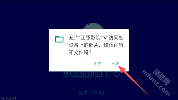 打开江豚影院TV盒子点击允许授予权限;