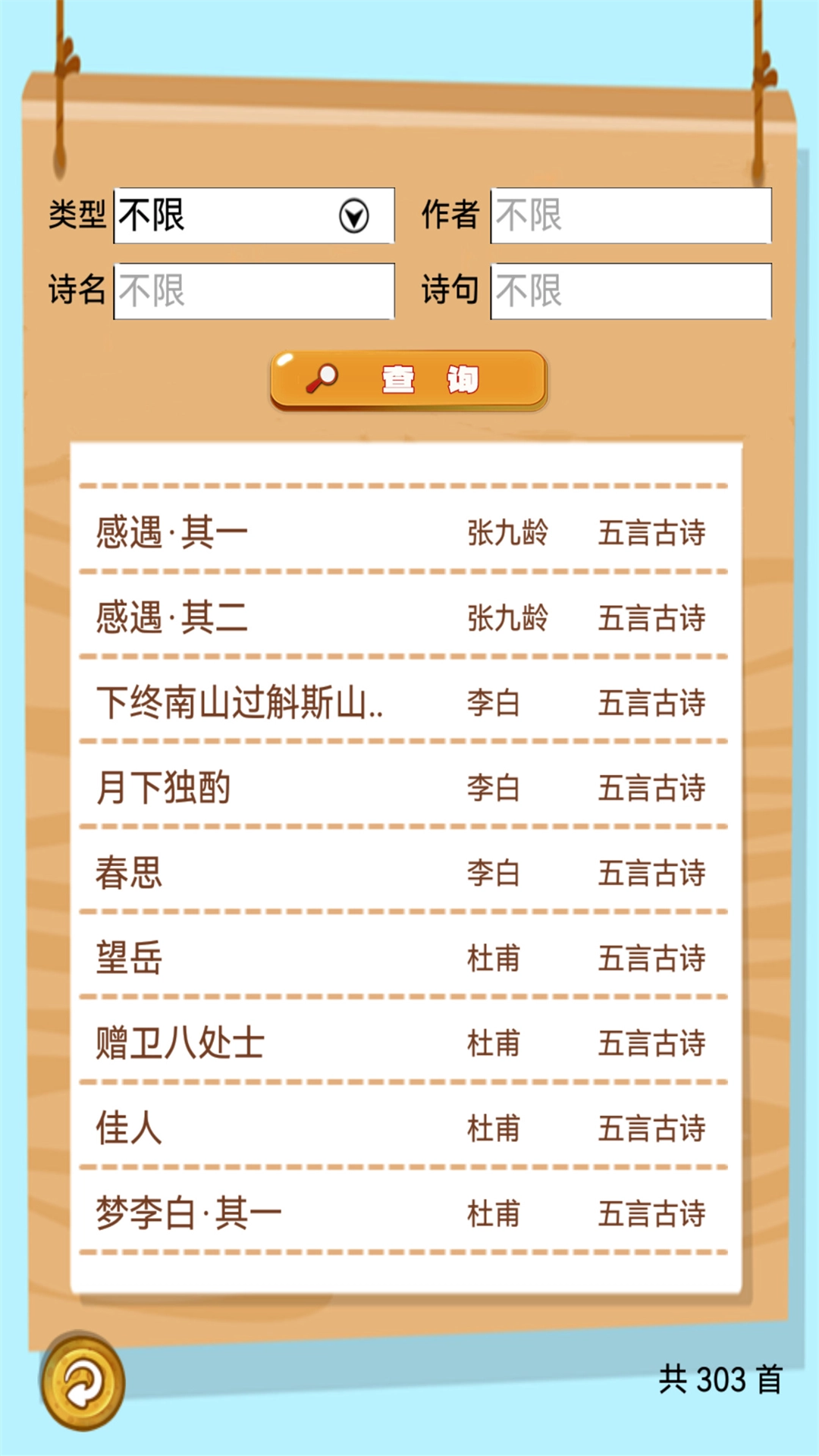 在主界面,您能利用顶部的搜索栏,输入诗歌的标题、作者或者关键词来搜索。搜索结果会以列表形式展示,点击就能进入该诗歌的详情页面。您还可以通过目录浏览,按照作者或诗歌类型来筛选查找。