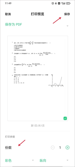 你可以先选择想要保存的文件格式,设定好打印数量,再调整文件的方向和颜色,之后点击右上角的保存按钮就可以了。