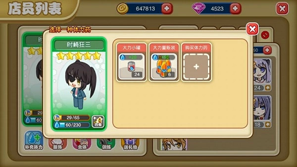 可以单独查看每位店员的个人状态,当店员体力不足时可进行补充,体力药水可在商店购买。