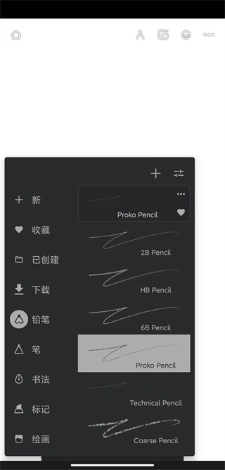 在这个页面选好一支画笔后,点击黑色区域右上角“+”号的旁边位置,就能进入画笔详细参数的设置界面了。
