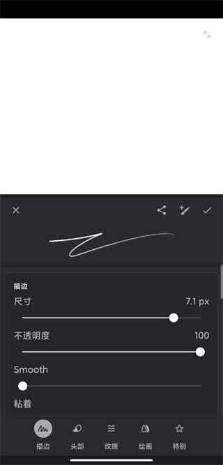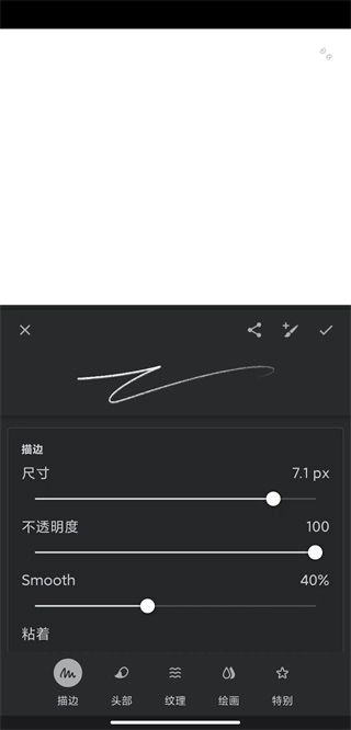 在这个页面里找到“SMOOTH”字样,它对应的就是画笔平滑度的设置参数,把数值调整到30%到50%之间比较合适,过高的话效果反而会打折扣,设置完成后点击右上角的对勾确认就可以了。