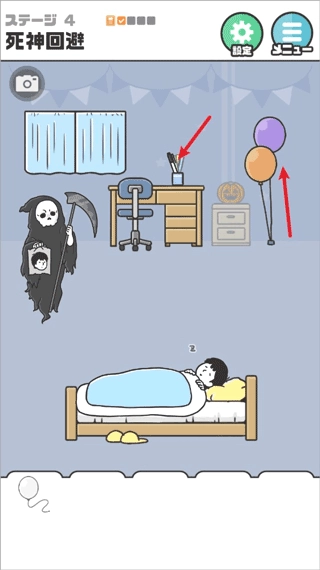 从桌上取来马克笔,再拿起旁边的气球,把这两样东西组合起来,就能得到一个画有人脸的气球。将这个气球放到人的身上,死神就会错把它当成本人带走,这样就能顺利通过这一关了。
