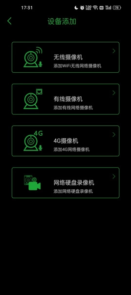 接下来选择你要添加的设备,依据摄像头的类型来添加,这里包含无线摄像机、有线摄像机、4G摄像机、网络硬盘录像机这四类设备。