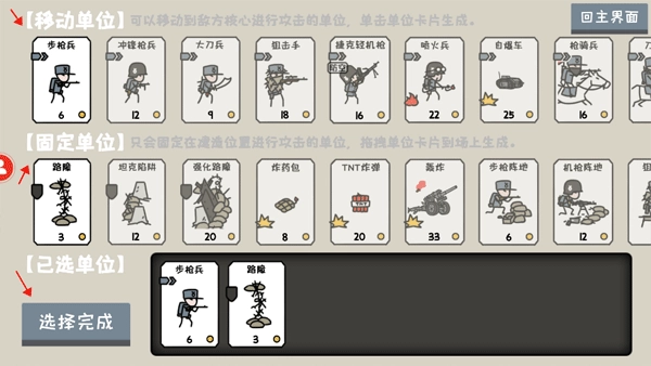 接下来点击“遭遇战”,玩家需要对单位进行组合,包括移动单位与固定单位。其中,移动单位能够移动至敌方核心发起攻击,固定单位则只会停留在建造位置进行攻击。玩家需从上方选择移动单位和固定单位,选好后点击“选择完成”即可。