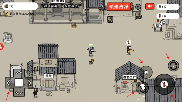 左侧的按键是角色移动方向键,用于控制小士兵的移动方向;右侧则为角色功能键:带有方向指向的图标可实现翻跟头动作,借此躲避敌人发射的子弹;小石子图标对应投掷小石子功能,该功能无使用限制且能无限补充;右侧显示数字的图标用于切换武器,当前武器组合为步枪与大刀;中间最大的子弹图标则是开枪功能键。