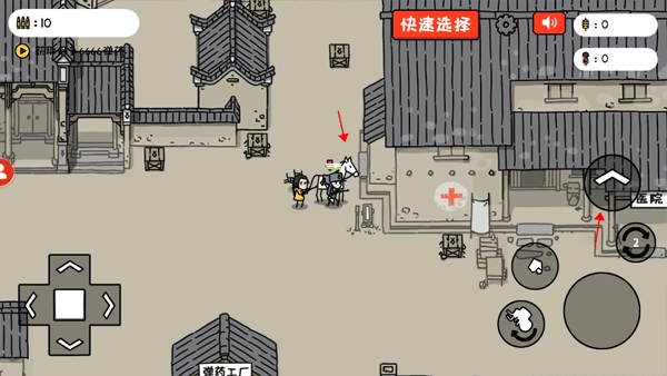 玩家按照红色箭头的指引找到一匹马,靠近马时右侧会自动出现向上的箭头,点击该箭头就能上马。若想下马,只需点击右侧的向下方向键即可。