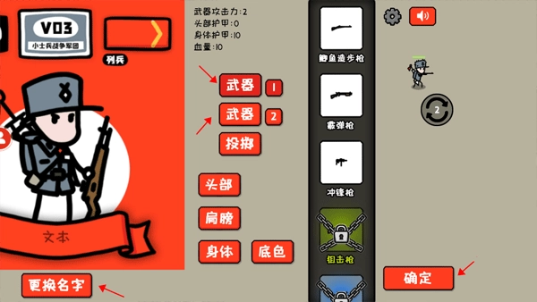 接下来继续介绍主界面的“装备”功能键,它主要用于设置角色的各类信息,比如更换角色名字、搭配武器1与武器2,还有头部、肩膀、身体部位的设置以及底色调整,完成设置后点击确定按钮就可以了。