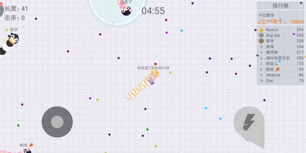 在游戏界面里,玩家左手的操作圈负责移动和调整方向,右手区域则用来操控加速技能的开启与关闭。使用加速技能会消耗小蛇的一点长度,所以得留意控制技能的使用时机。